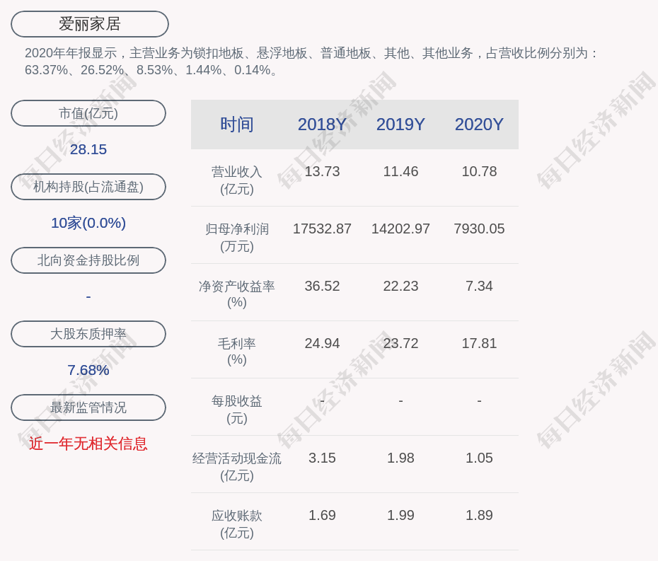 2020年年报显示,爱丽家居的主营业务为锁扣地板、悬浮地板、普通地板、其他、其他业务,占营收比例分别为:63.37%、26.52%、8.53%、1.44%、0.14%。