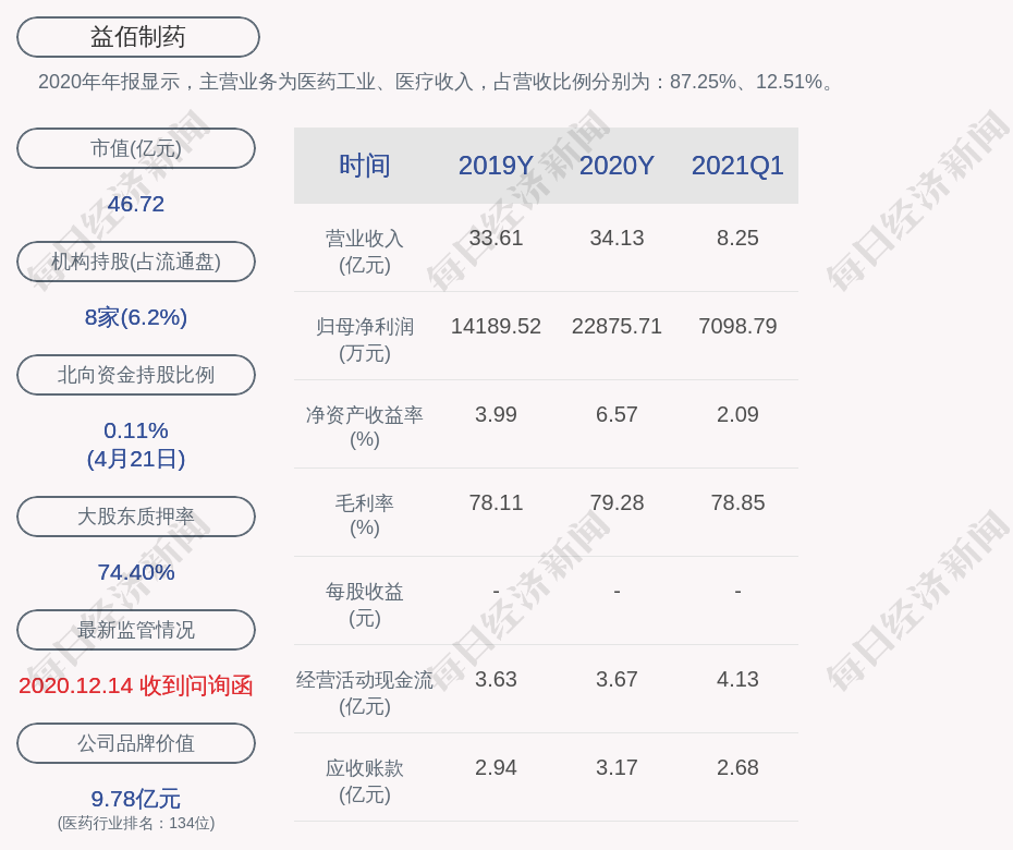 2020年年报显示,益佰制药的主营业务为医药工业、医疗收入,占营收比例分别为:87.25%、12.51%。