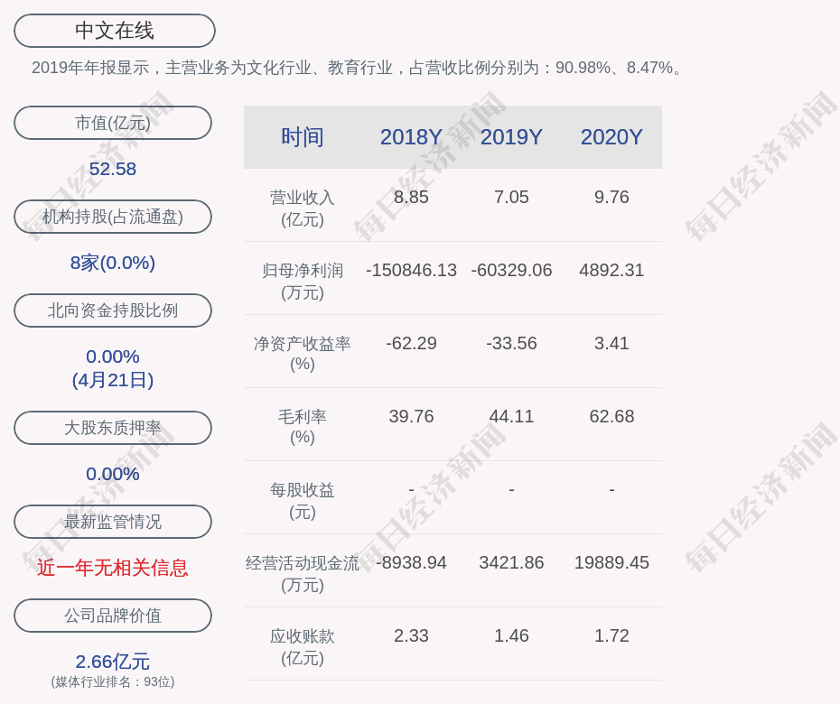 2019年年报显示,中文在线的主营业务为文化行业、教育行业,占营收比例分别为:90.98%、8.47%。