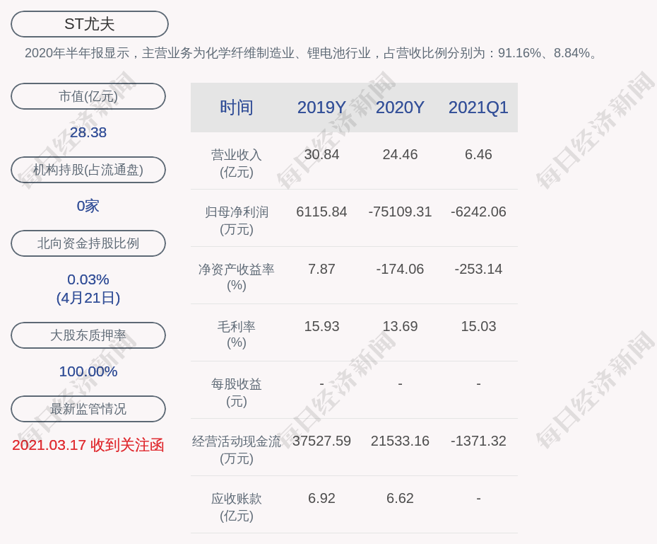 2020年半年报显示,ST尤夫的主营业务为化学纤维制造业、锂电池行业,占营收比例分别为:91.16%、8.84%。