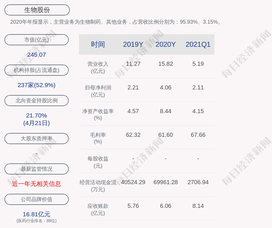 2020年年报显示,生物股份的主营业务为生物制药、其他业务,占营收比例分别为:95.93%、3.15%。