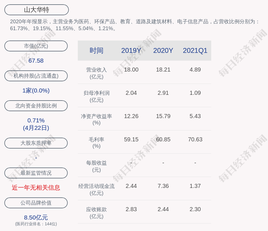 2020年年报显示,山大华特的主营业务为医药、环保产品、教育、道路及建筑材料、电子信息产品,占营收比例分别为:61.73%、19.15%、11.55%、5.04%、1.21%。