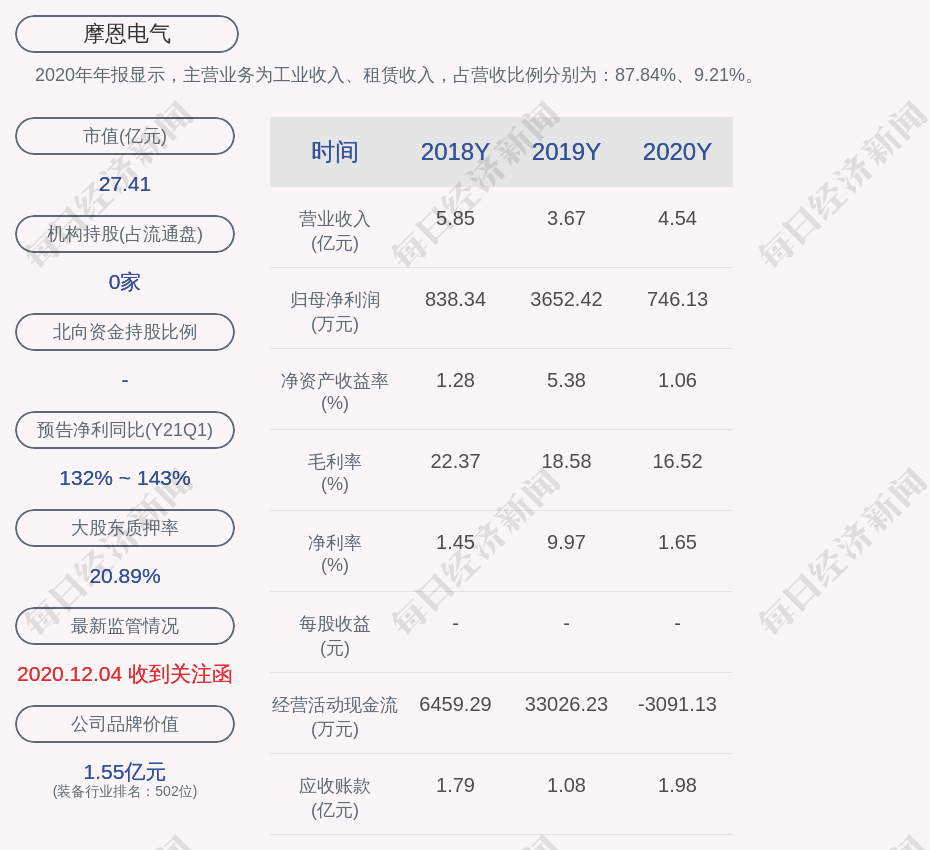 2020年年报显示,摩恩电气的主营业务为工业收入、租赁收入,占营收比例分别为:87.84%、9.21%。