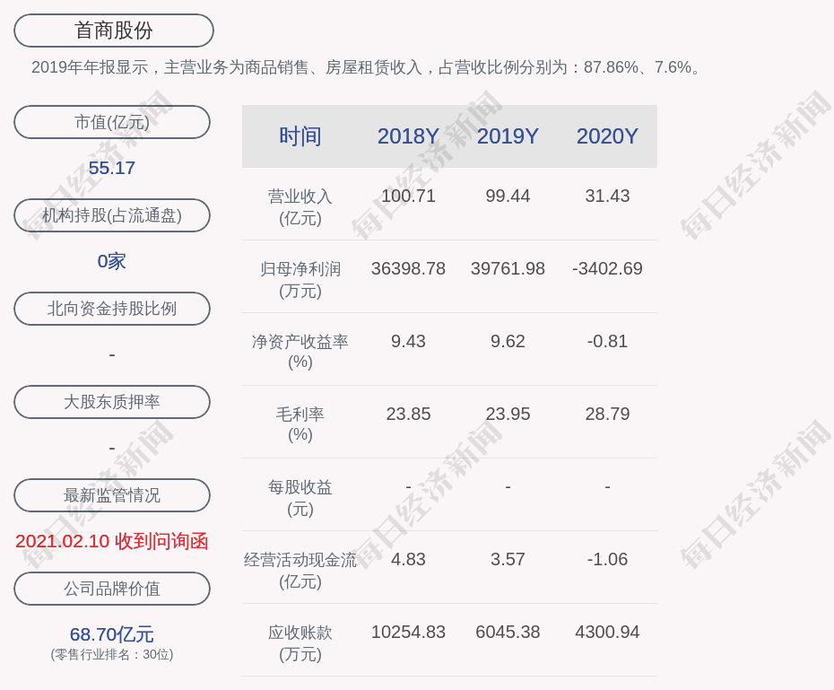 2019年年报显示,首商股份的主营业务为商品销售、房屋租赁收入,占营收比例分别为:87.86%、7.6%。