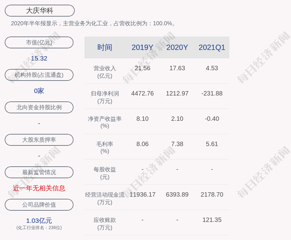 2020年半年报显示,大庆华科的主营业务为化工业,占营收比例为:100.0%。