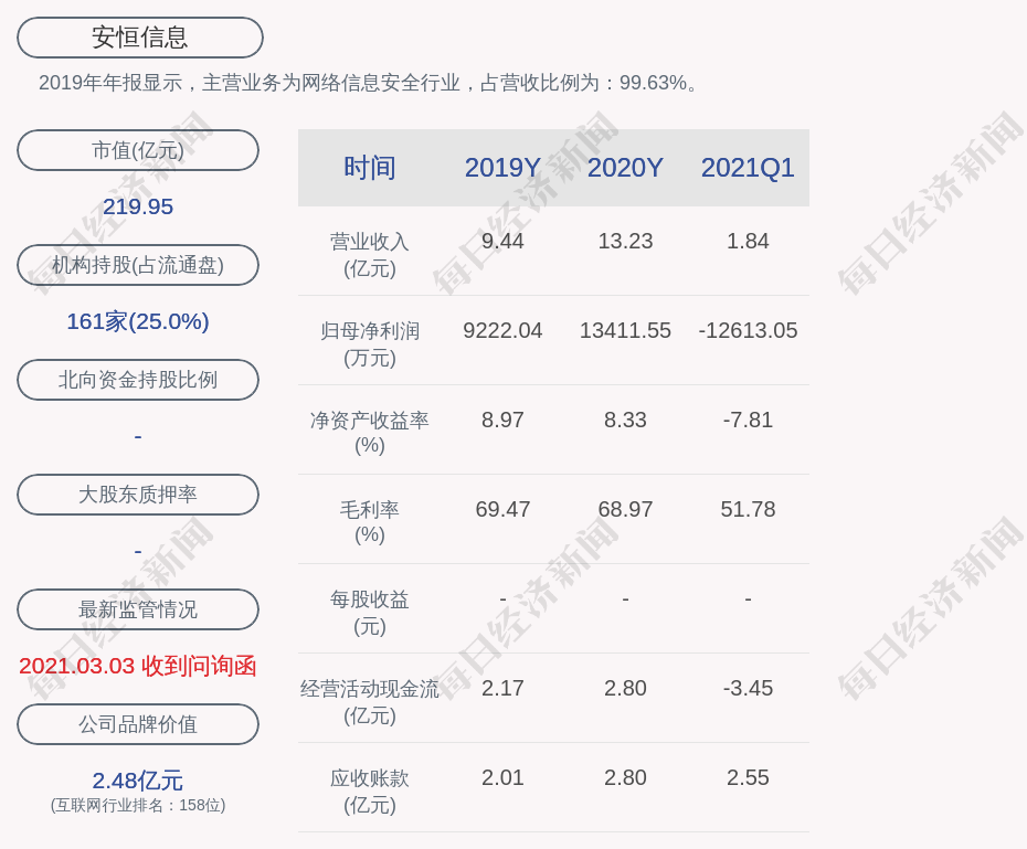 2019年年报显示,安恒信息的主营业务为网络信息安全行业,占营收比例为:99.63%。