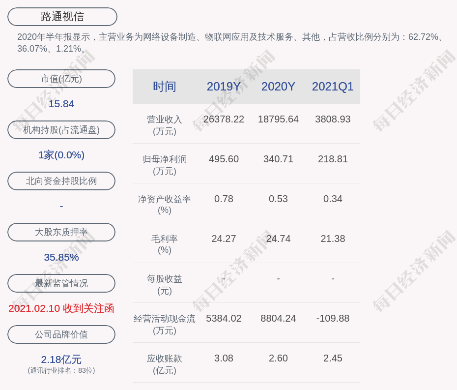 2020年半年报显示,路通视信的主营业务为网络设备制造、物联网应用及技术服务、其他,占营收比例分别为:62.72%、36.07%、1.21%。