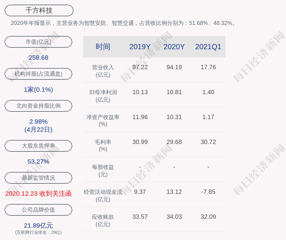 2020年年报显示,千方科技的主营业务为智慧安防、智慧交通,占营收比例分别为:51.68%、48.32%。