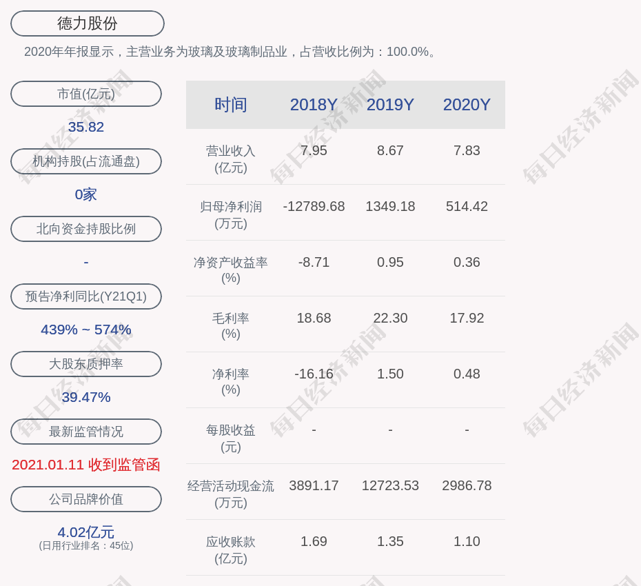 2020年年报显示,德力股份的主营业务为玻璃及玻璃制品业,占营收比例为:100.0%。