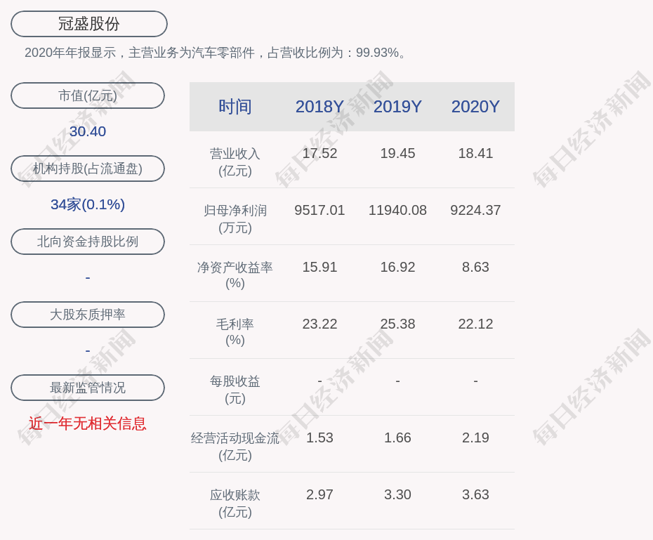 2020年年报显示,冠盛股份的主营业务为汽车零部件,占营收比例为:99.93%。