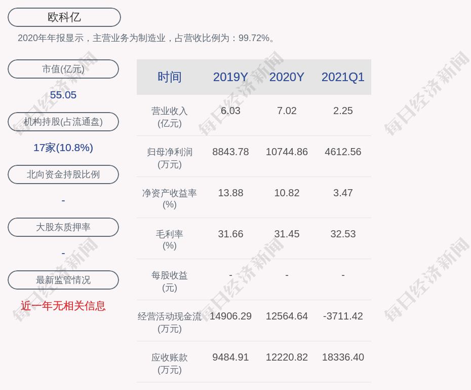 2020年年报显示,欧科亿的主营业务为制造业,占营收比例为:99.72%。