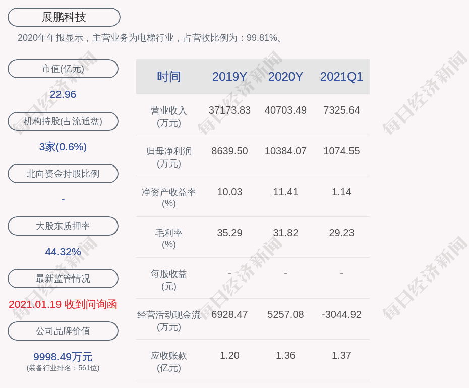 2020年年报显示,展鹏科技的主营业务为电梯行业,占营收比例为:99.81%。