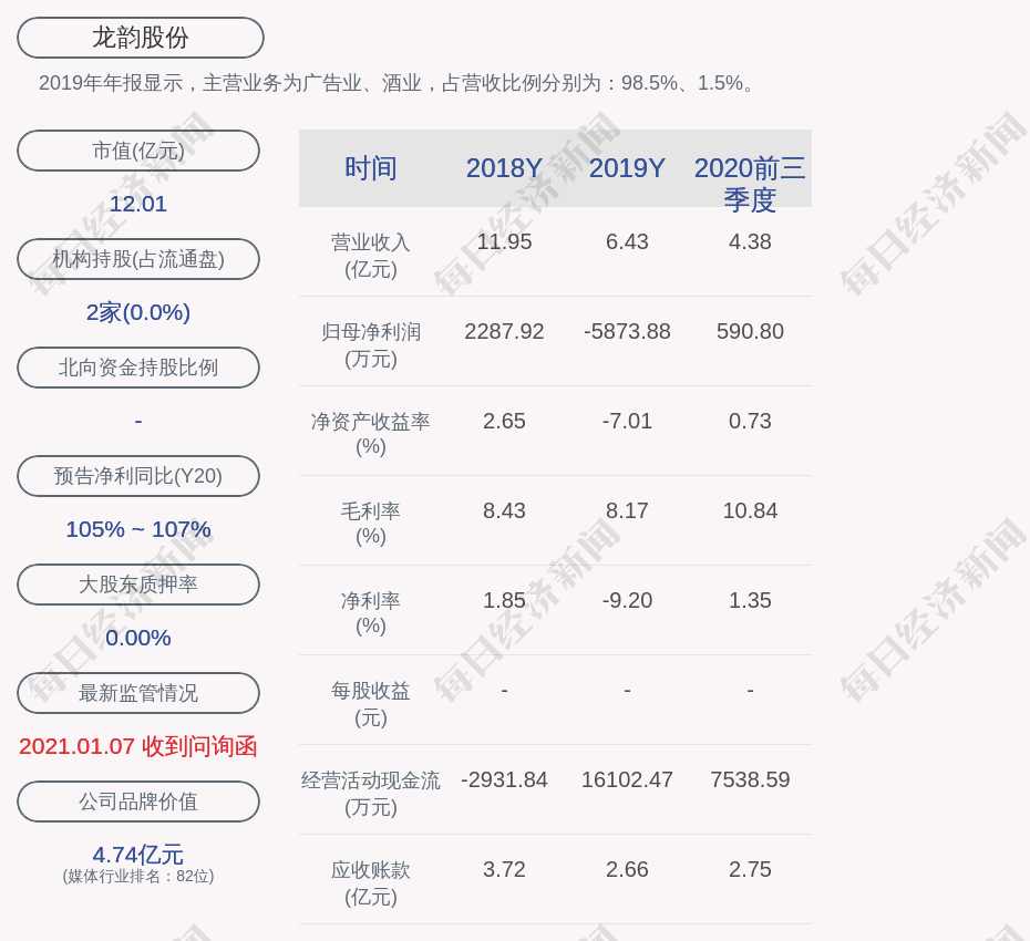 2019年年报显示,龙韵股份的主营业务为广告业、酒业,占营收比例分别为:98.5%、1.5%。
