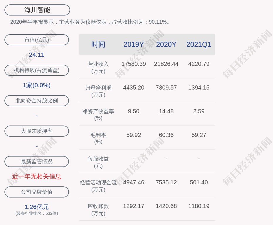 2020年半年报显示,海川智能的主营业务为仪器仪表,占营收比例为:90.11%。