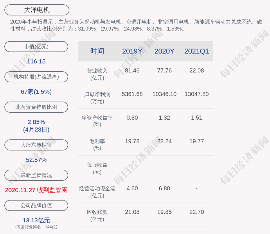 2020年半年报显示,大洋电机的主营业务为起动机与发电机、空调用电机、非空调用电机、新能源车辆动力总成系统、磁性材料,占营收比例分别为:31.09%、29.97%、24.98%、8.37%、1.53%。
