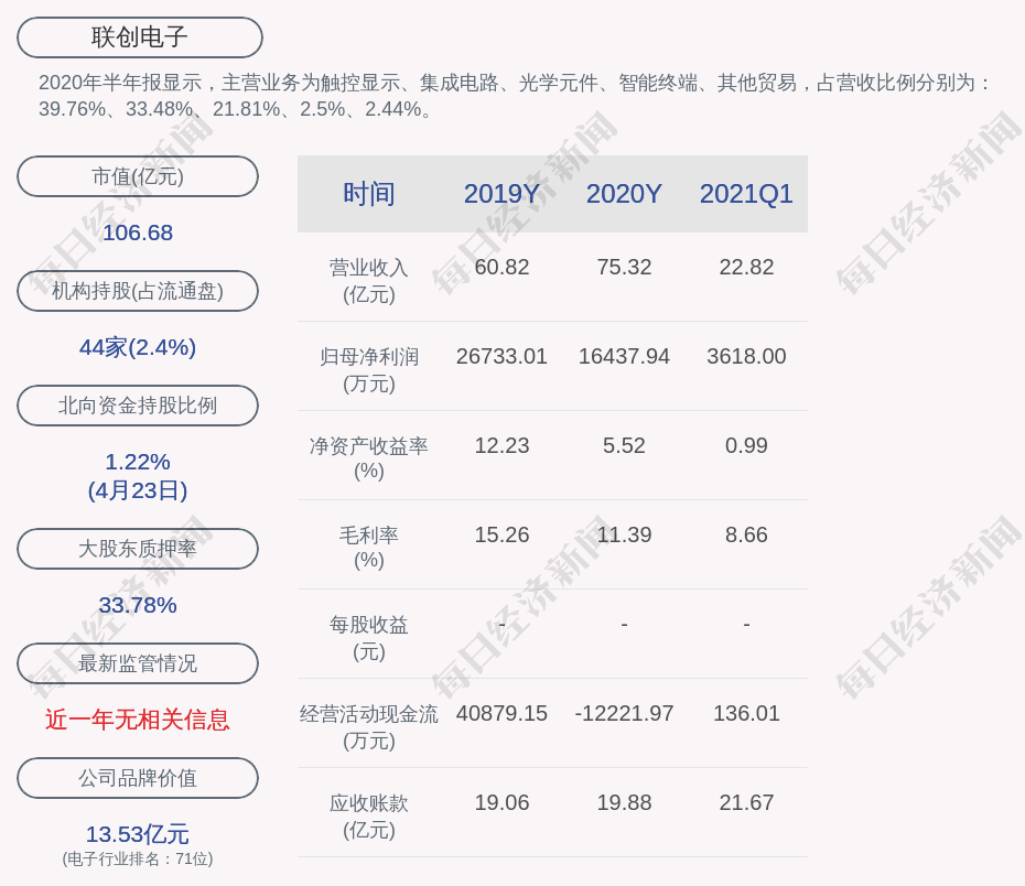 2020年半年报显示,联创电子的主营业务为触控显示、集成电路、光学元件、智能终端、其他贸易,占营收比例分别为:39.76%、33.48%、21.81%、2.5%、2.44%。