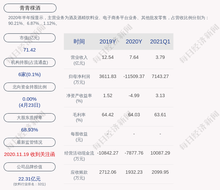 2020年半年报显示,青青稞酒的主营业务为酒及酒精饮料业、电子商务平台业务、其他批发零售,占营收比例分别为:90.21%、6.87%、1.12%。