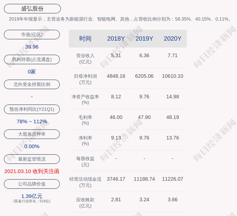 2019年年报显示,盛弘股份的主营业务为新能源行业、智能电网、其他,占营收比例分别为:58.35%、40.15%、0.11%。