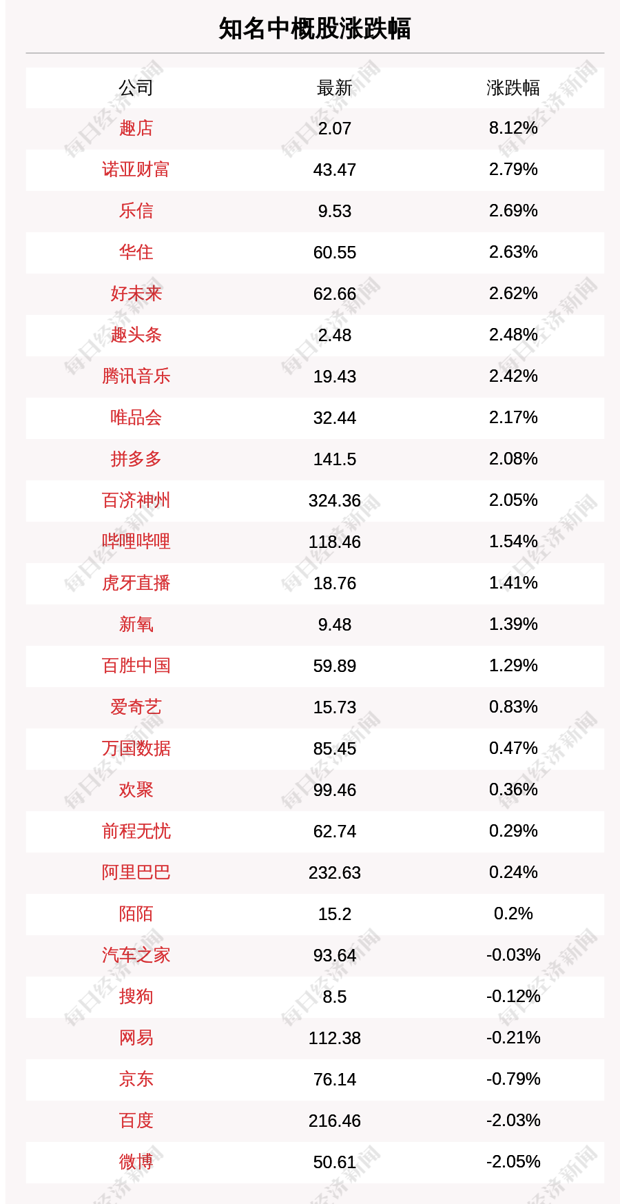 每经AI快讯:北京时间4月27日05:30,知名中概股中趣店、诺亚财富、乐信、华住、好未来涨幅居前,收盘分别上涨8.12%、2.79%、2.69%、2.63%、2.62%。微博、百度、京东、网易、搜狗跌幅居前,收盘分别下跌2.05%、2.03%、0.79%、0.21%、0.12%。