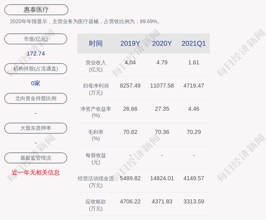2020年年报显示,惠泰医疗的主营业务为医疗器械,占营收比例为:99.69%。