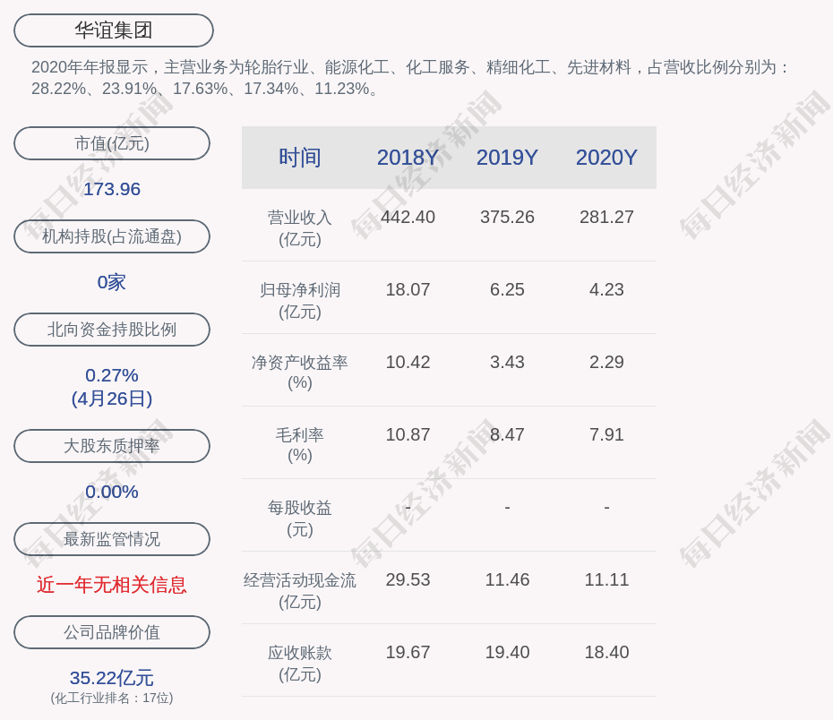 2020年年报显示,华谊集团的主营业务为轮胎行业、能源化工、化工服务、精细化工、先进材料,占营收比例分别为:28.22%、23.91%、17.63%、17.34%、11.23%。