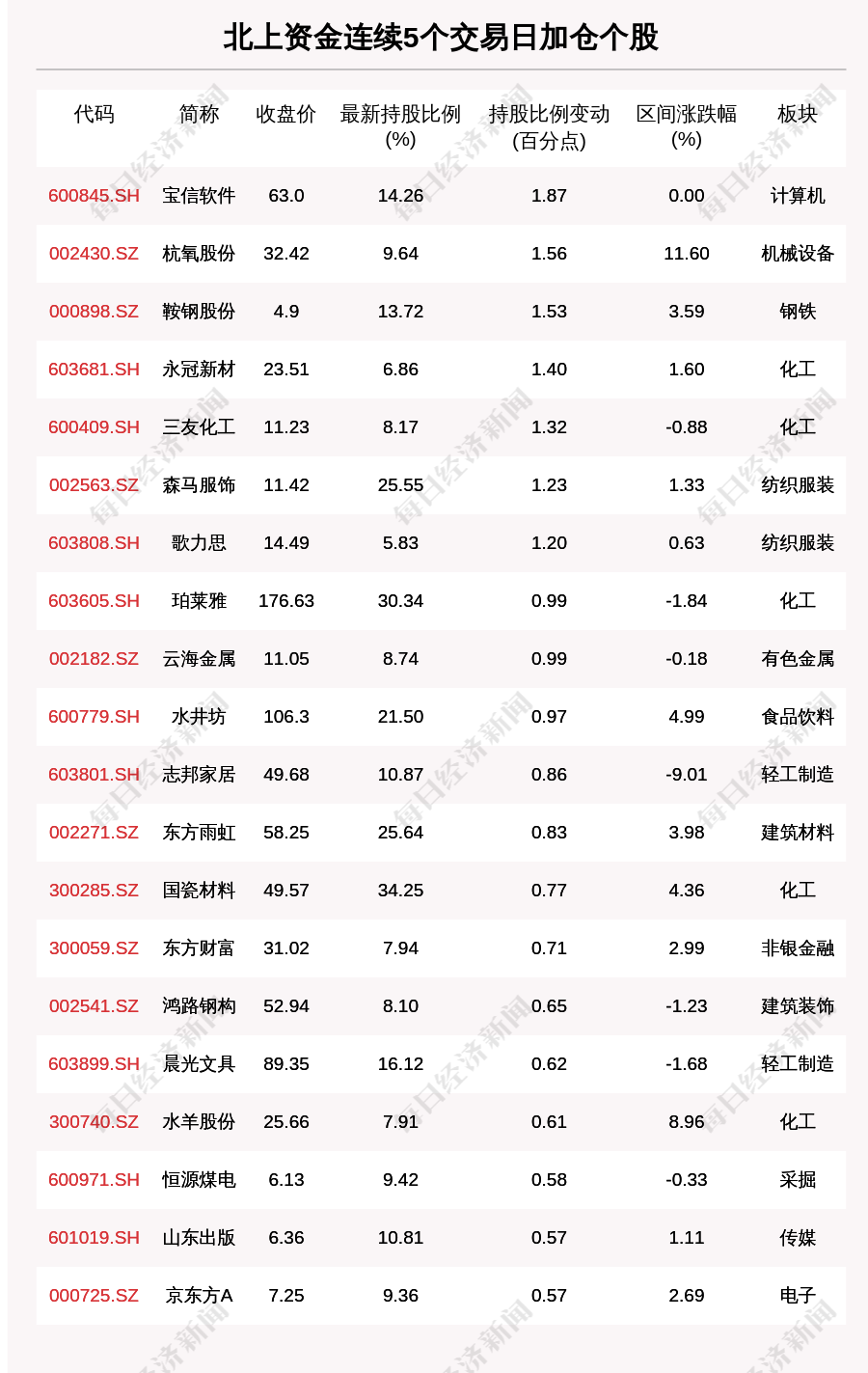 每经AI快讯,4月26日,北上资金连续5个交易日买入61个股。北上资金连续5个交易日加仓个股中,宝信软件(600845.SH,收盘价:63.0元)增持比例增幅最大,5个交易日增持1.87个百分点,其他增持比例较大的个股包括杭氧股份(002430.SZ,收盘价:32.42元)、鞍钢股份(000898.SZ,收盘价:4.9元)、永冠新材(603681.SH,收盘价:23.51元),分别增持1.56个百分点、1.53个百分点、1.40个百分点。
