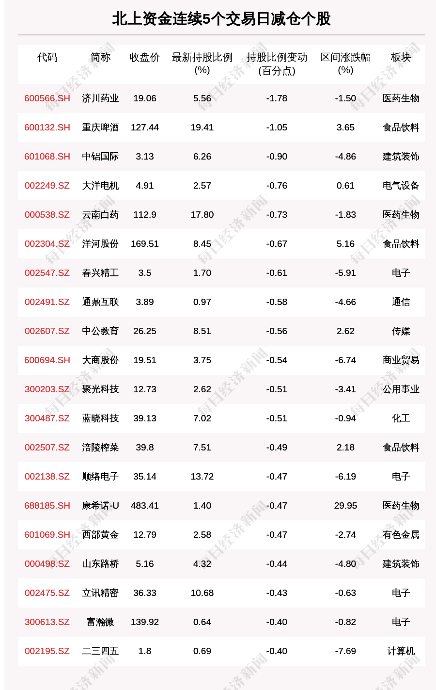 每经AI快讯,4月26日,北上资金连续5个交易日卖出99个股。北上资金连续5个交易日减仓个股中,济川药业(600566.SH,收盘价:19.06元)减持比例增幅最大,5个交易日减持1.78百分点,其他跌幅较大的个股包括重庆啤酒(600132.SH,收盘价:127.44元)、中铝国际(601068.SH,收盘价:3.13元)、大洋电机(002249.SZ,收盘价:4.91元),分别减持1.05个百分点、0.90个百分点、0.76个百分点。