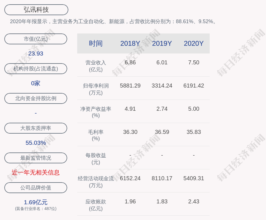 2020年年报显示,弘讯科技的主营业务为工业自动化、新能源,占营收比例分别为:88.61%、9.52%。