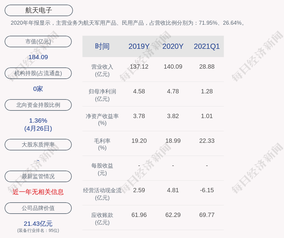 2020年年报显示,航天电子的主营业务为航天军用产品、民用产品,占营收比例分别为:71.95%、26.64%。