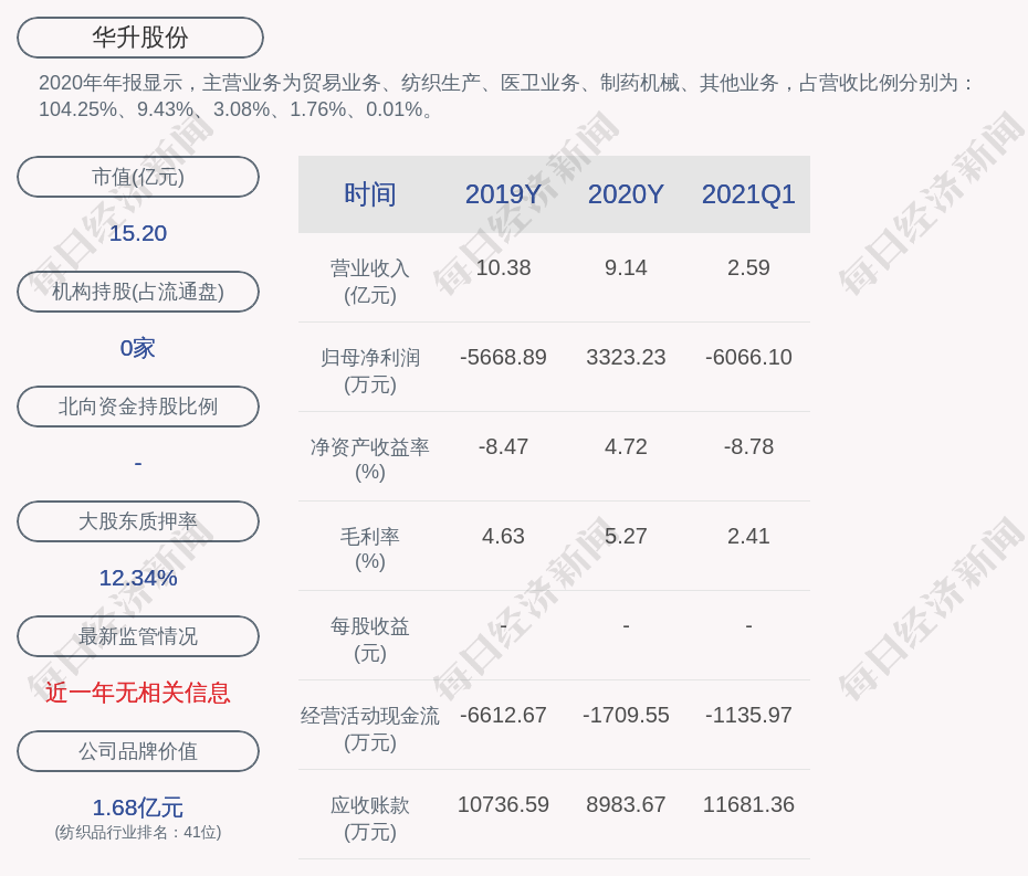 2020年年报显示,华升股份的主营业务为贸易业务、纺织生产、医卫业务、制药机械、其他业务,占营收比例分别为:104.25%、9.43%、3.08%、1.76%、0.01%。