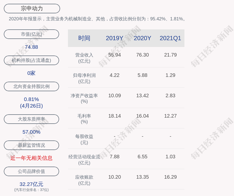 2020年年报显示,宗申动力的主营业务为机械制造业、其他,占营收比例分别为:95.42%、1.81%。