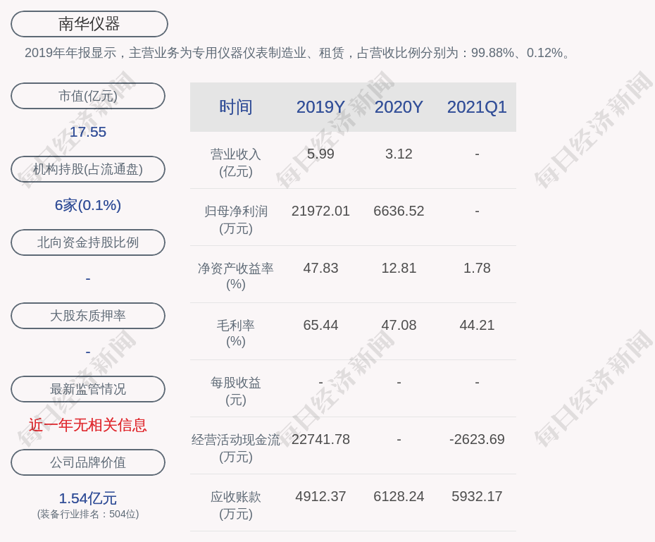 2019年年报显示,南华仪器的主营业务为专用仪器仪表制造业、租赁,占营收比例分别为:99.88%、0.12%。