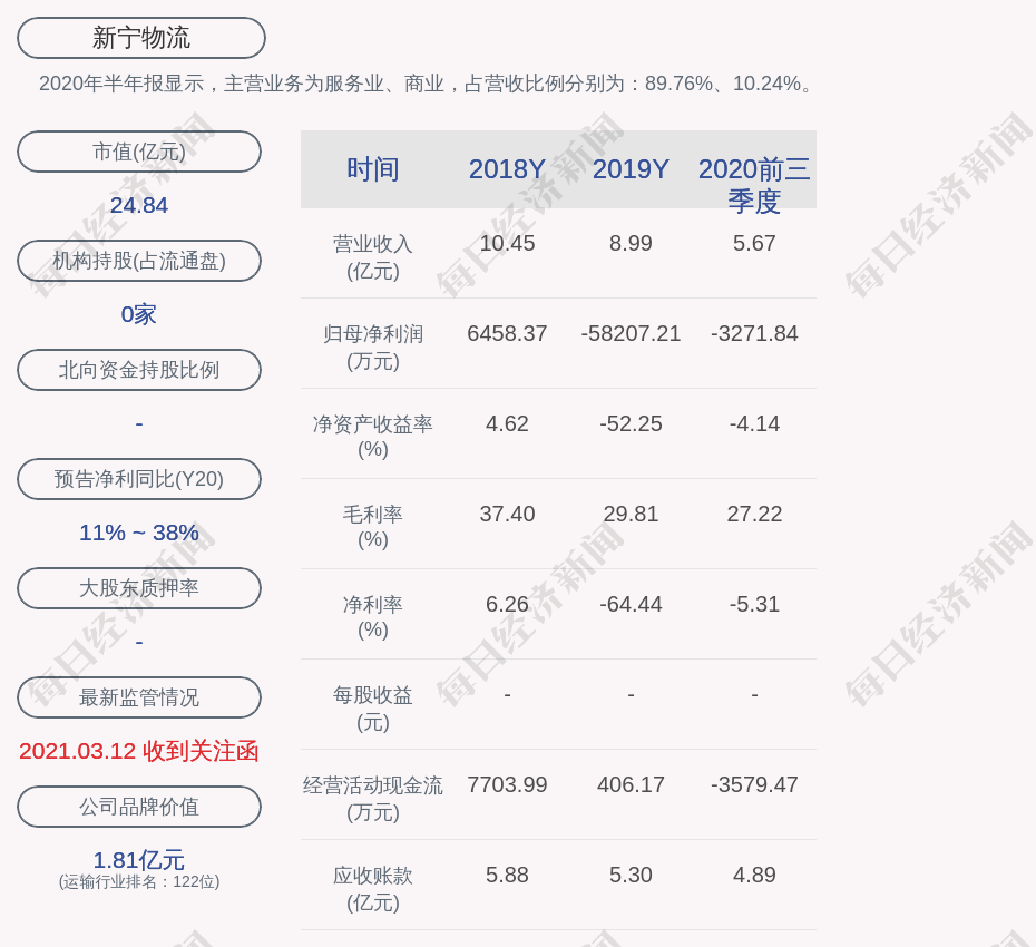 2020年半年报显示,新宁物流的主营业务为服务业、商业,占营收比例分别为:89.76%、10.24%。