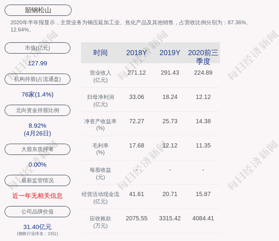 2020年半年报显示,韶钢松山的主营业务为钢压延加工业、焦化产品及其他销售,占营收比例分别为:87.36%、12.64%。