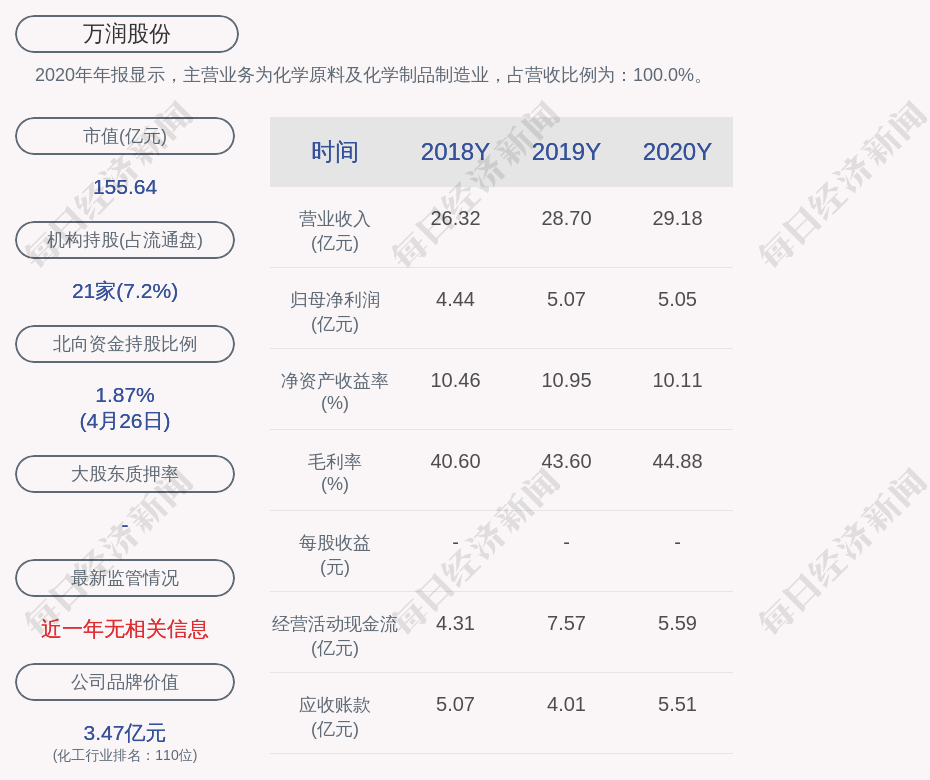 2020年年报显示,万润股份的主营业务为化学原料及化学制品制造业,占营收比例为:100.0%。