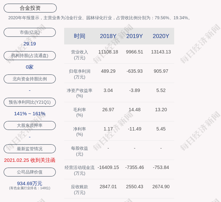 2020年年报显示,合金投资的主营业务为冶金行业、园林绿化行业,占营收比例分别为:79.56%、19.34%。