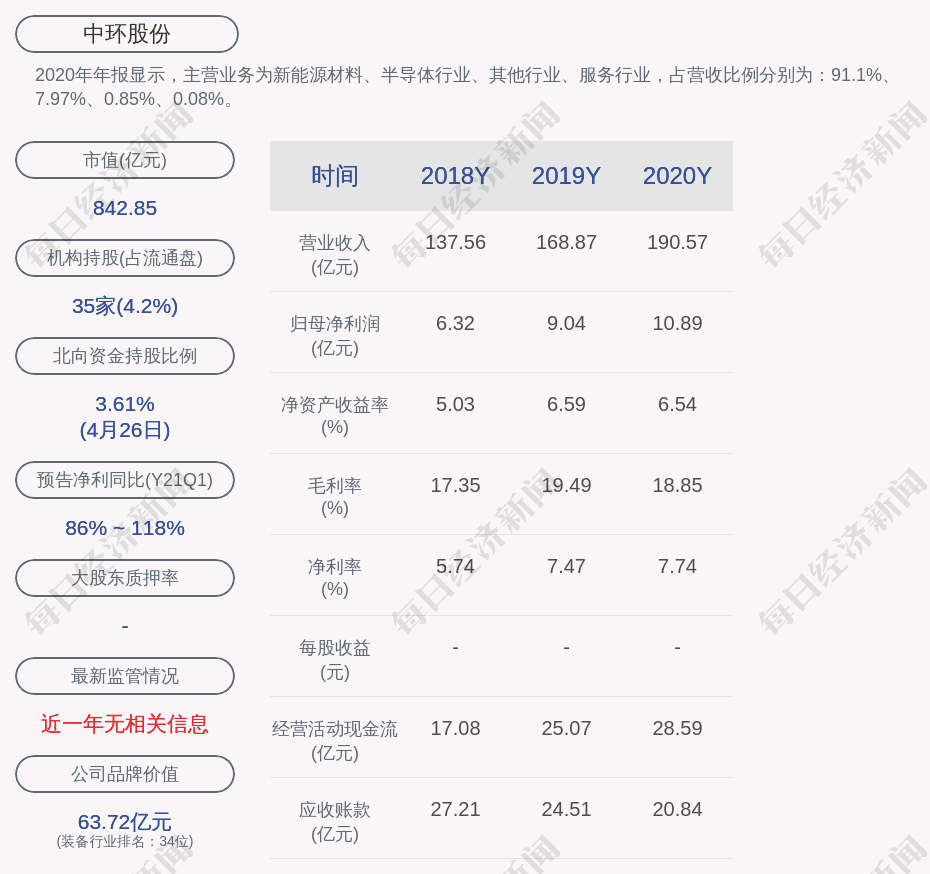 2020年年报显示,中环股份的主营业务为新能源材料、半导体行业、其他行业、服务行业,占营收比例分别为:91.1%、7.97%、0.85%、0.08%。