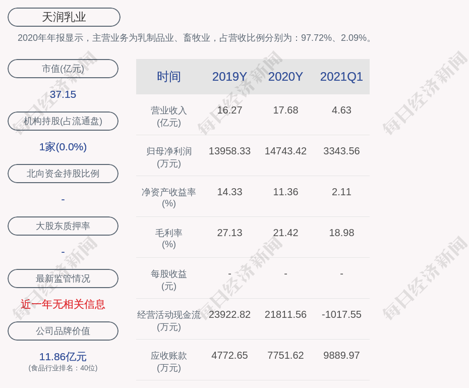 2020年年报显示,天润乳业的主营业务为乳制品业、畜牧业,占营收比例分别为:97.72%、2.09%。