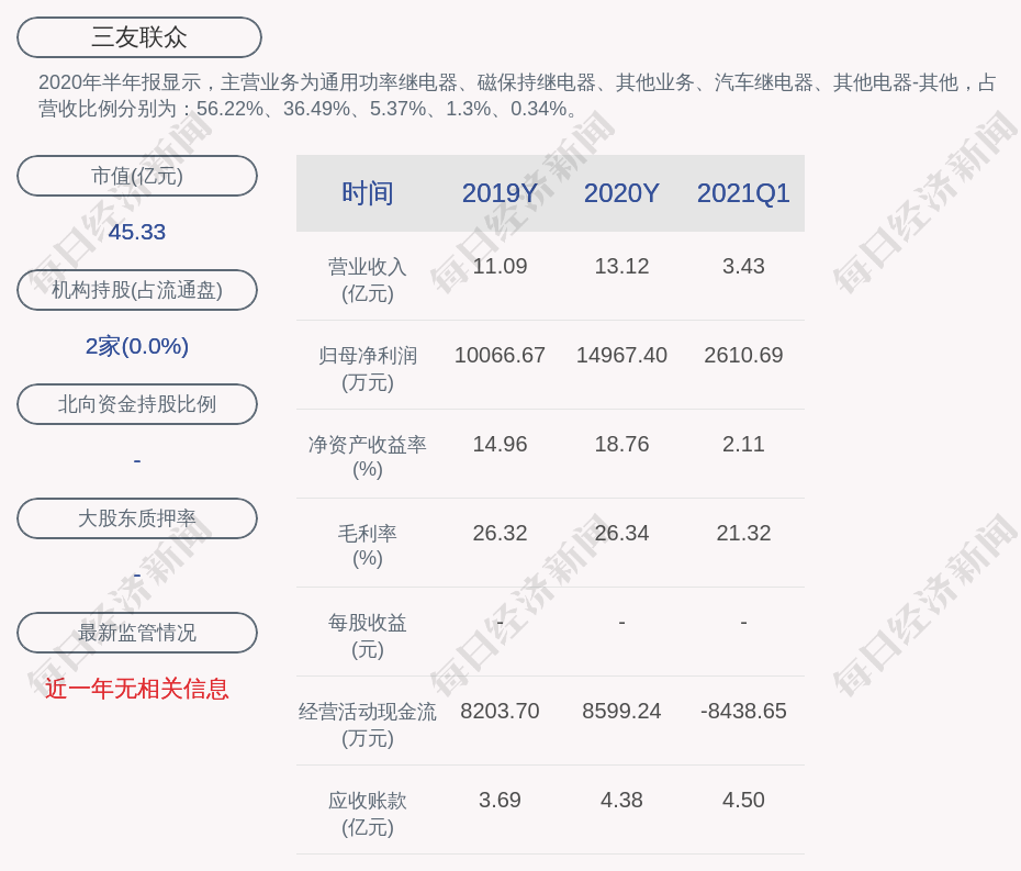 2020年半年报显示,三友联众的主营业务为通用功率继电器、磁保持继电器、其他业务、汽车继电器、其他电器-其他,占营收比例分别为:56.22%、36.49%、5.37%、1.3%、0.34%。