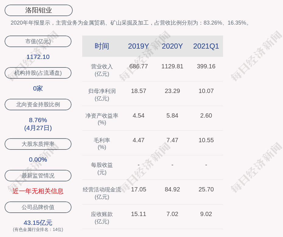 2020年年报显示,洛阳钼业的主营业务为金属贸易、矿山采掘及加工,占营收比例分别为:83.26%、16.35%。