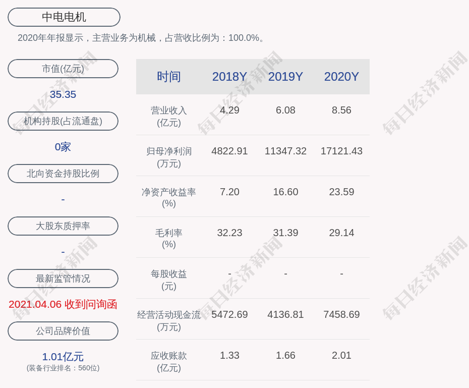 2020年年报显示,中电电机的主营业务为机械,占营收比例为:100.0%。