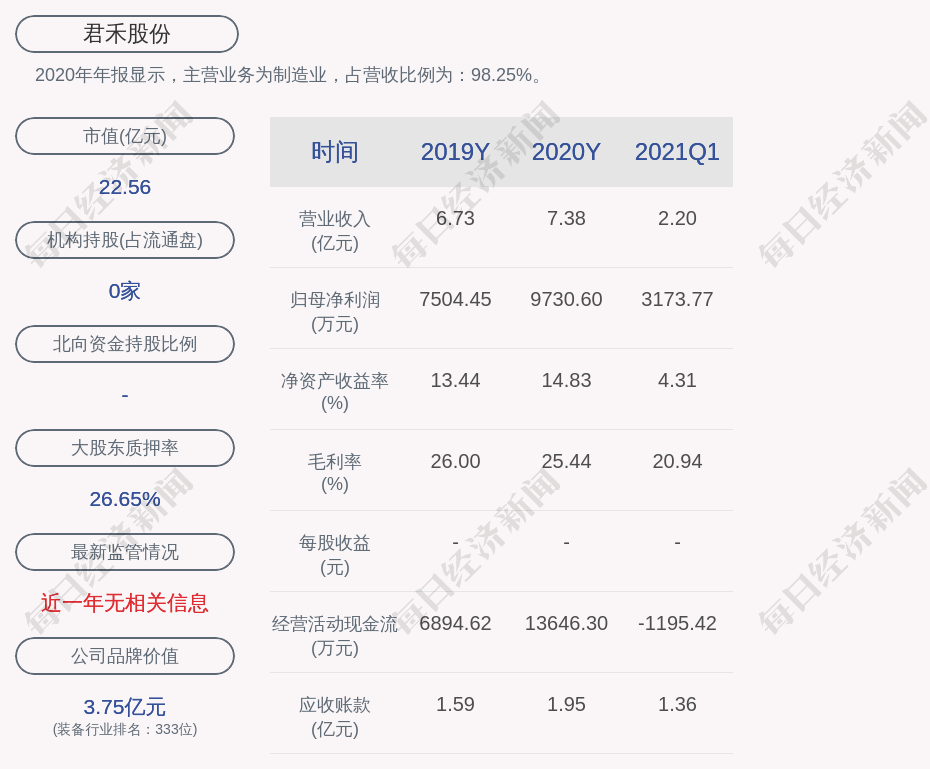 2020年年报显示,君禾股份的主营业务为制造业,占营收比例为:98.25%。