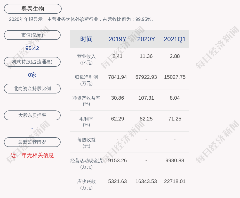 2020年年报显示,奥泰生物的主营业务为体外诊断行业,占营收比例为:99.95%。