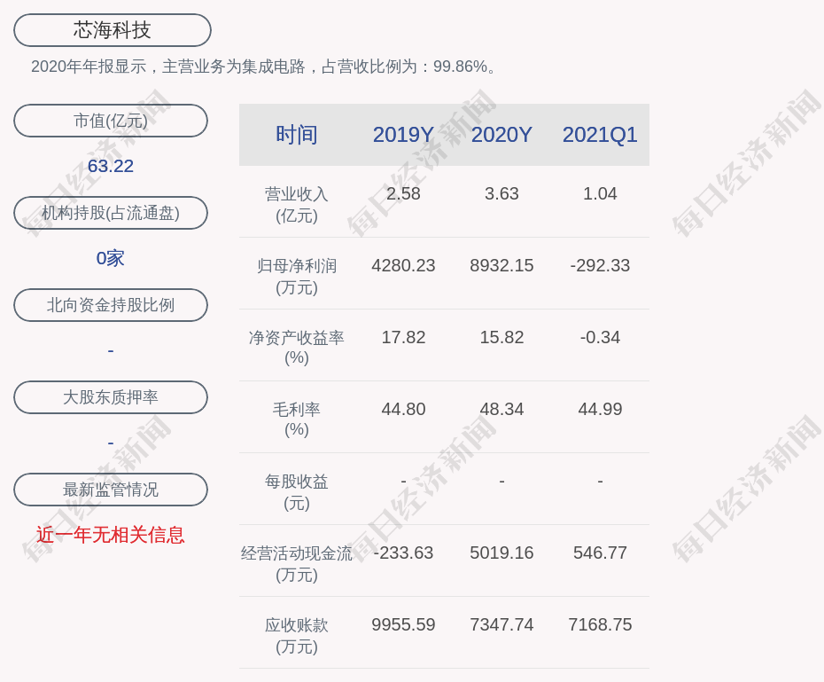2020年年报显示,芯海科技的主营业务为集成电路,占营收比例为:99.86%。