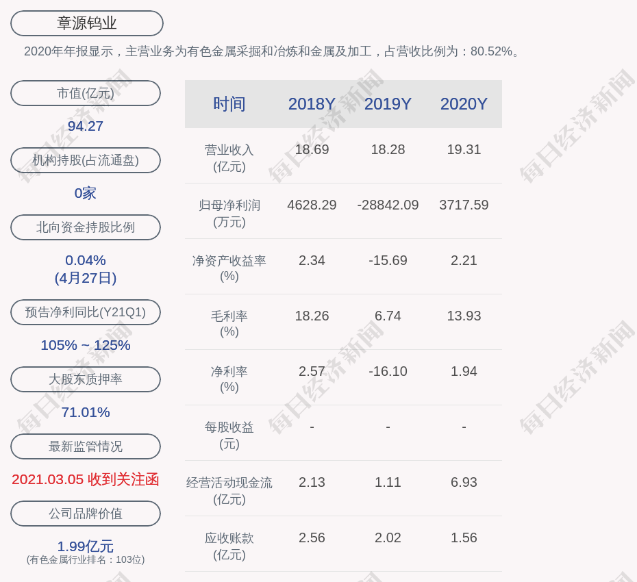 2020年年报显示,章源钨业的主营业务为有色金属采掘和冶炼和金属及加工,占营收比例为:80.52%。