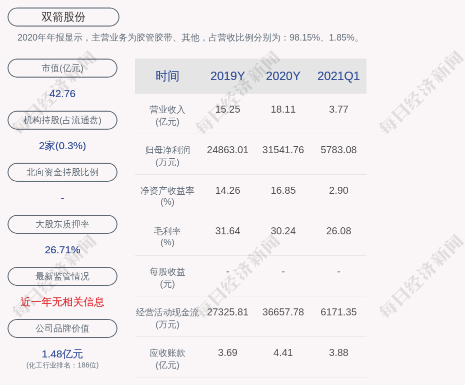 2020年年报显示,双箭股份的主营业务为胶管胶带、其他,占营收比例分别为:98.15%、1.85%。