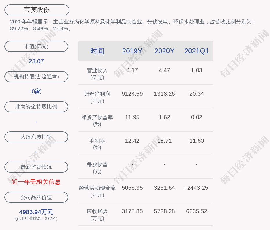 2020年年报显示,宝莫股份的主营业务为化学原料及化学制品制造业、光伏发电、环保水处理业,占营收比例分别为:89.22%、8.46%、2.09%。