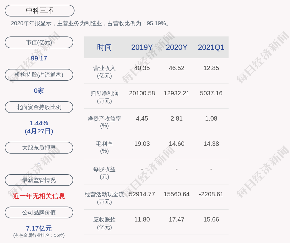 2020年年报显示,中科三环的主营业务为制造业,占营收比例为:95.19%。