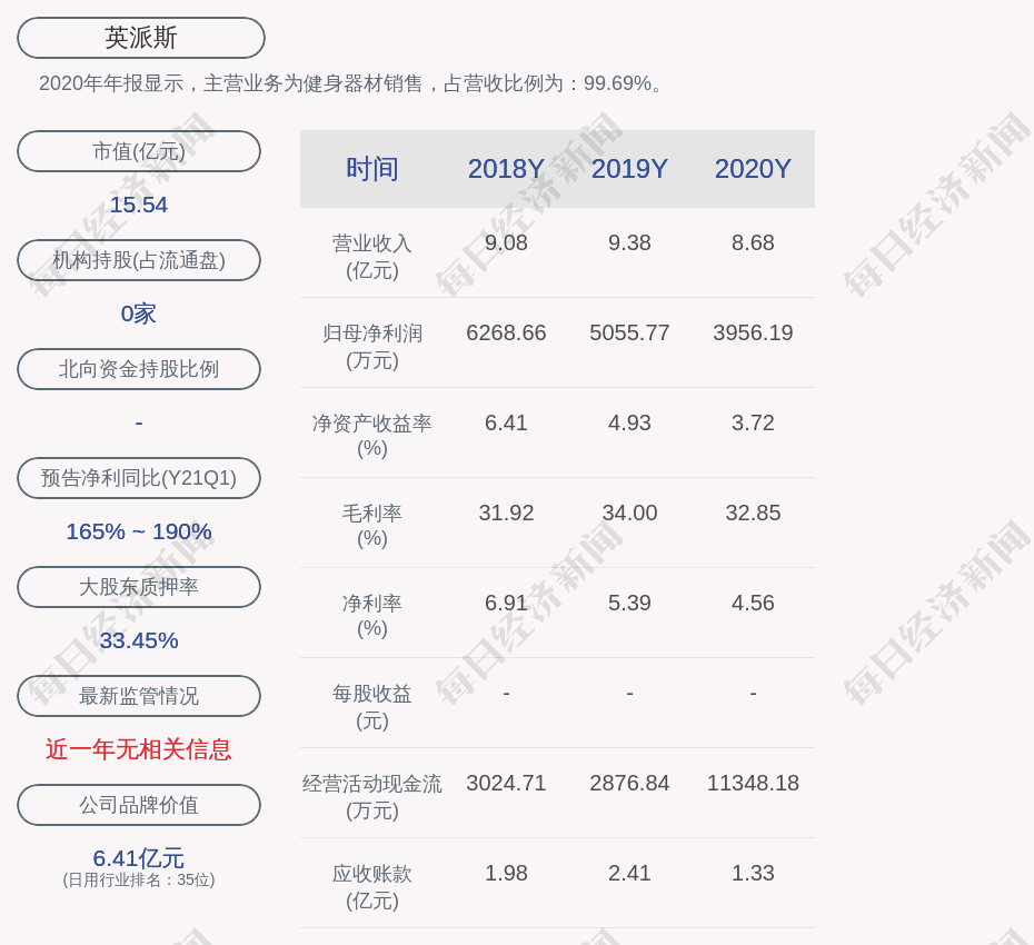 2020年年报显示,英派斯的主营业务为健身器材销售,占营收比例为:99.69%。