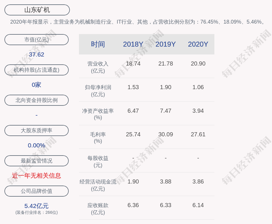 2020年年报显示,山东矿机的主营业务为机械制造行业、IT行业、其他,占营收比例分别为:76.45%、18.09%、5.46%。